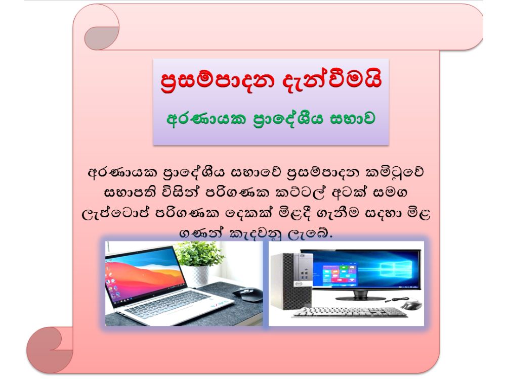 අරණායක ප්රාදේශිය සභාවේ ප්රසම්පාදන කමිටුවේ සභාපති විසින් පහත සදහන් අයුරින් පරිගණක කට්ටල් අටක් සමග ලැප්ටොප් පරිගණක දෙකක් මිළදී ගැනීම සදහා මිළ ගණන් කැදවනු ලැබේ.