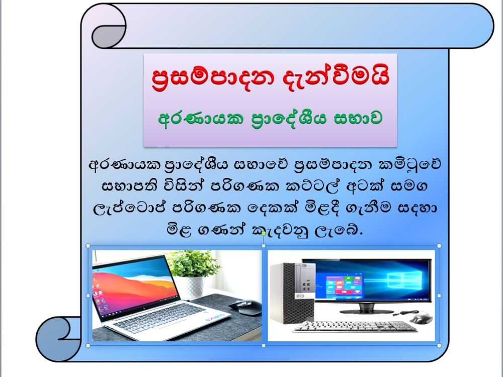 අරණායක ප්රාදේශීය සභාවේ ප්රසම්පාදන කමිටුවේ සභාපති විසින් පරිගණක කට්ටල් අටක් සමග ලැප්ටොප් පරිගණක දෙකක් මිළදී ගැනීම සදහා මිළ ගණන් කැදවනු ලැබේ.